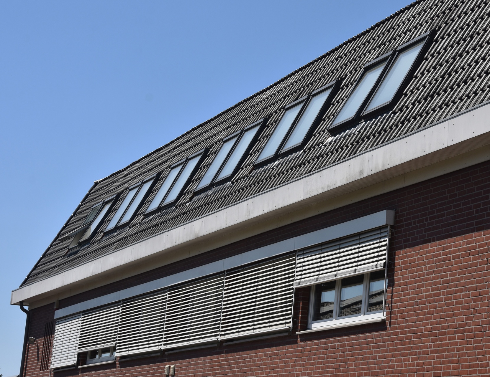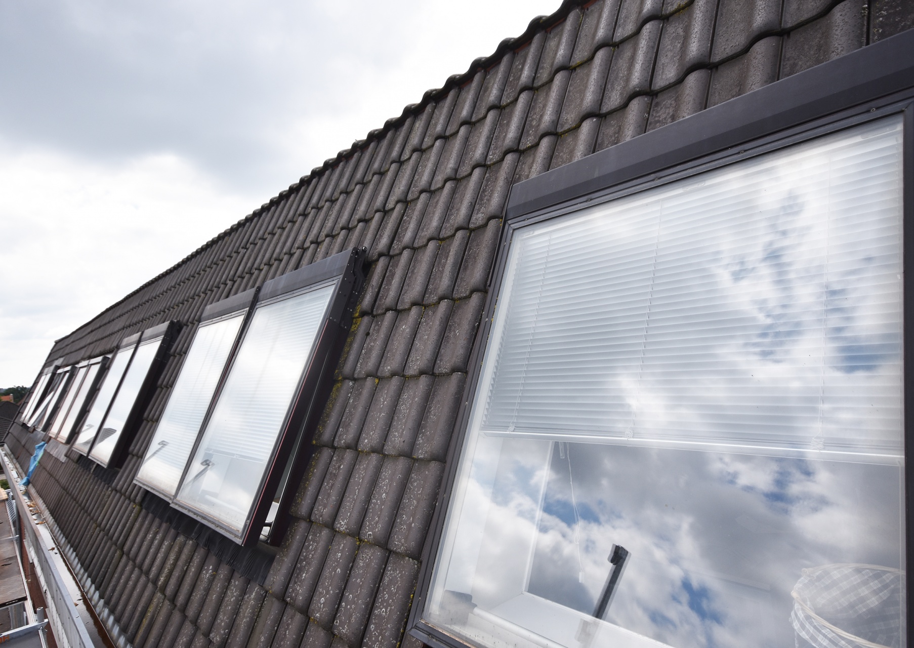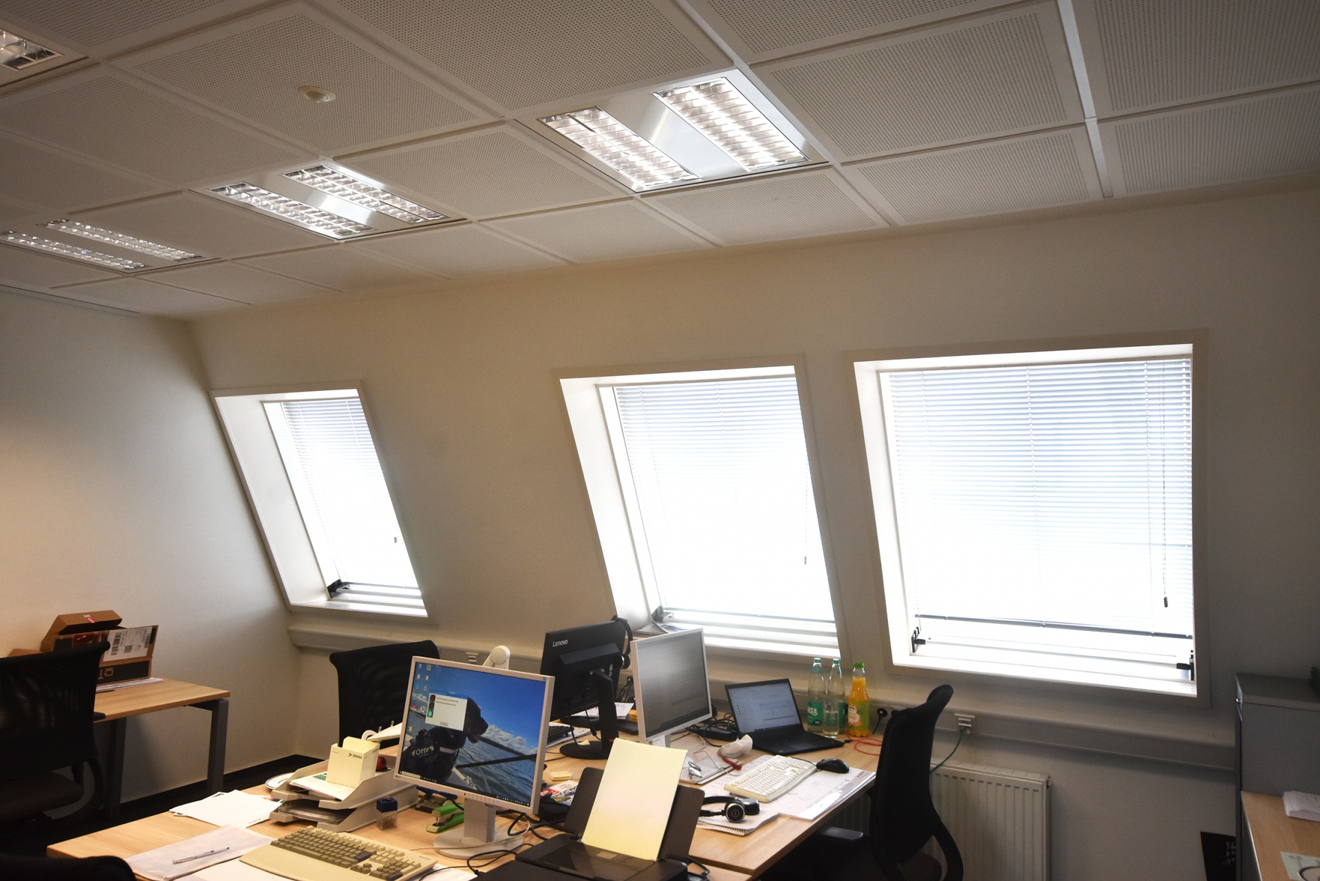 Im Konferenzraum wurde das Austauschfenster mit einem Mehrzweck-Ausstieg FEU P2 kombiniert, das im Bedarfsfall als zweiter Rettungsweg genutzt werden kann. Im Flur wurden drei alte Fenster durch FAKRO Kunststoff-Schwingfenster PTP-V U3 in der Größe 67x119 cm mit regulierbarer Dauerlüftung ausgetauscht. Bei allen Fenstern wurde die alte Nischenverkleidungen beibehalten. Die Arbeitszeit hat sich damit auf etwa 1,5 Std. pro Element verkürzt. Das Team der Bocklage GmbH war nur drei Tage beschäftigt, um die 17 Dachfenster auszutauschen.