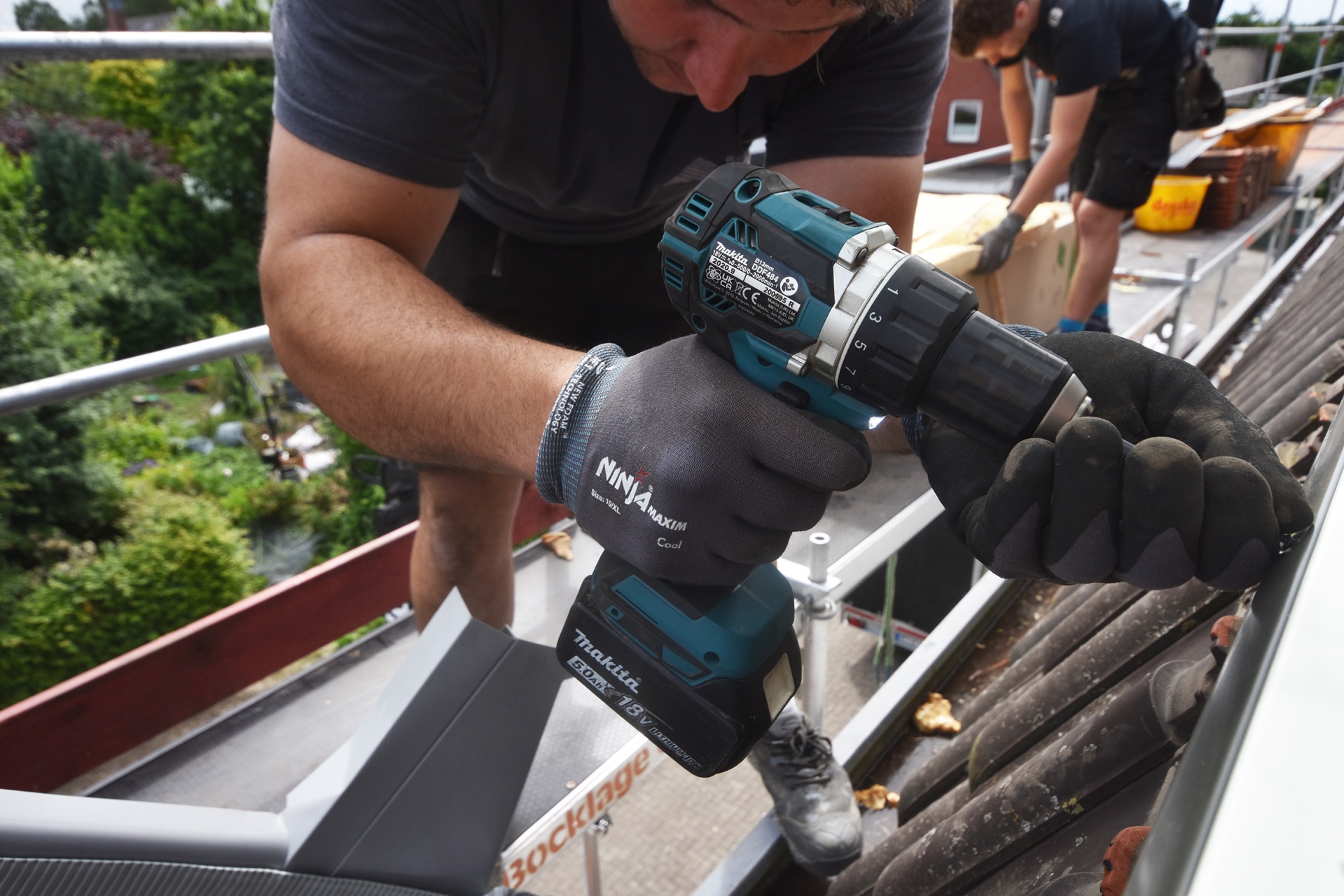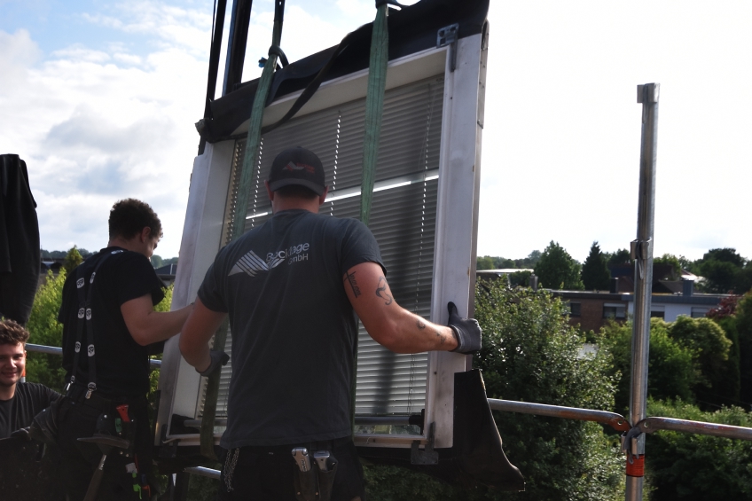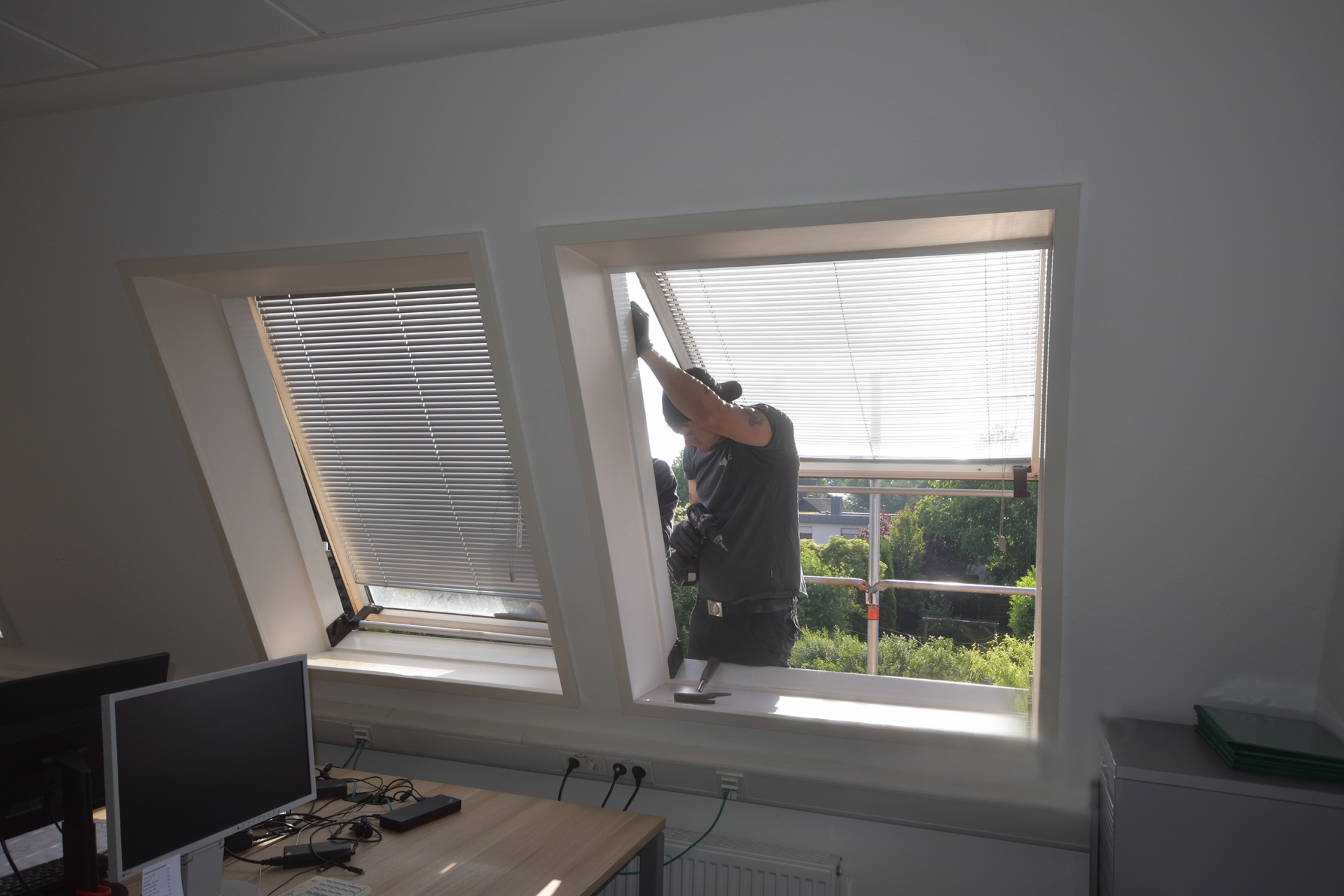 Im Konferenzraum wurde das Austauschfenster mit einem Mehrzweck-Ausstieg FEU P2 kombiniert, das im Bedarfsfall als zweiter Rettungsweg genutzt werden kann. Im Flur wurden drei alte Fenster durch FAKRO Kunststoff-Schwingfenster PTP-V U3 in der Größe 67x119 cm mit regulierbarer Dauerlüftung ausgetauscht. Bei allen Fenstern wurde die alte Nischenverkleidungen beibehalten. Die Arbeitszeit hat sich damit auf etwa 1,5 Std. pro Element verkürzt. Das Team der Bocklage GmbH war nur drei Tage beschäftigt, um die 17 Dachfenster auszutauschen.