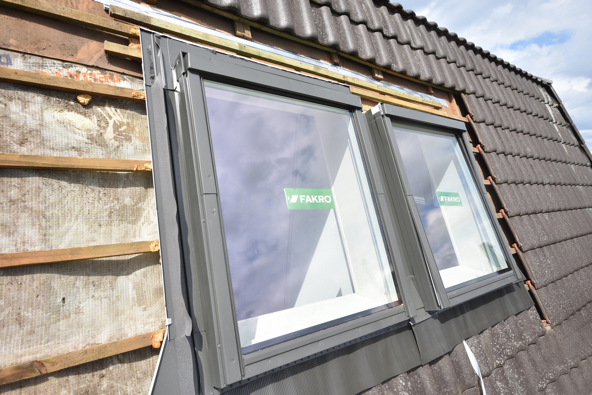 In den Büroräumen unter dem Dach wurden vierzehn weiße FAKRO Kunststoff-Schwingfenster PTP-V U3 mit den Maßen 115x137 cm mit regulierbarer Dauerlüftungsfunktion eingesetzt. Für die dichte Anbindung an das Bedachungsmaterial sorgt der Eindeckrahmen EHU-A, der höhenverstellbar ist und sich daher besonders für Austauschfenster eignet. Einige Fenster wurden in Kombination nebeneinander verbaut, so dass hier jeweils passende FAKRO Kombi-Eindeckrahmen EHU-A montiert werden konnten.